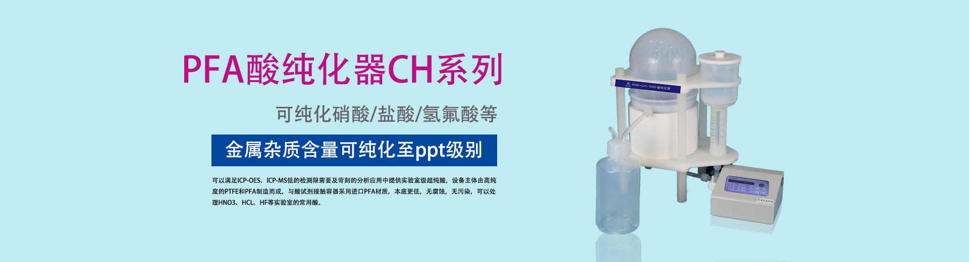 研發(fā)生產(chǎn):痕量分析器皿—PFA、FEP、PTFE系列產(chǎn)品,高壓消解罐,消解器,水熱合成反應(yīng)釜,酸純化器。